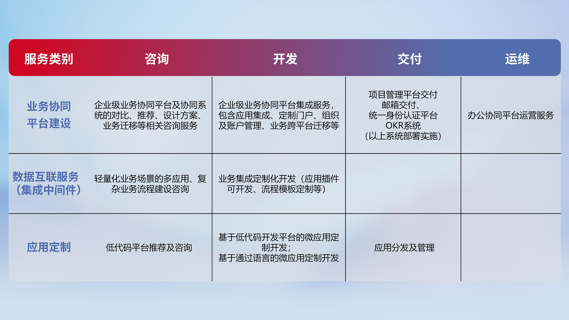 针对钉钉、、、、企微、、、、IDaas等平台级产品提供产品的规划、、方案、、、交付、、、、定制化开发等服务,,实现如统一协同办公、、、、智能客户服务、、、、混合会议管理、、智能数据查询、、、、等业务场景,,,,实现数字化转型。。