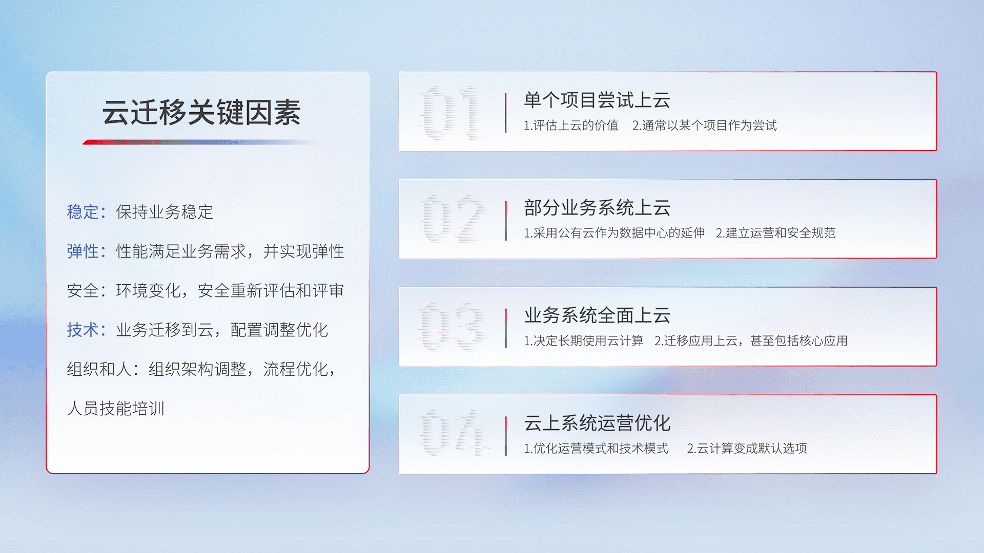 结合实际业务,,从规划设计、、、云平台选型、、、云原生改造、、、数据迁移、、、集成交付,,,迁移全过程为客户识别最佳上云路径,,,,做好风险识别管理,,设计网络架构、、、身份权限、、、、安全审计合规、、操作审计、、、、日志审计、、监控告警策略、、、、多站点容灾设计等,,对云上基础设施进行整体规划,,提升IT治理水平,,,以满足弹性、、、高可用、、高性能的需求。。。