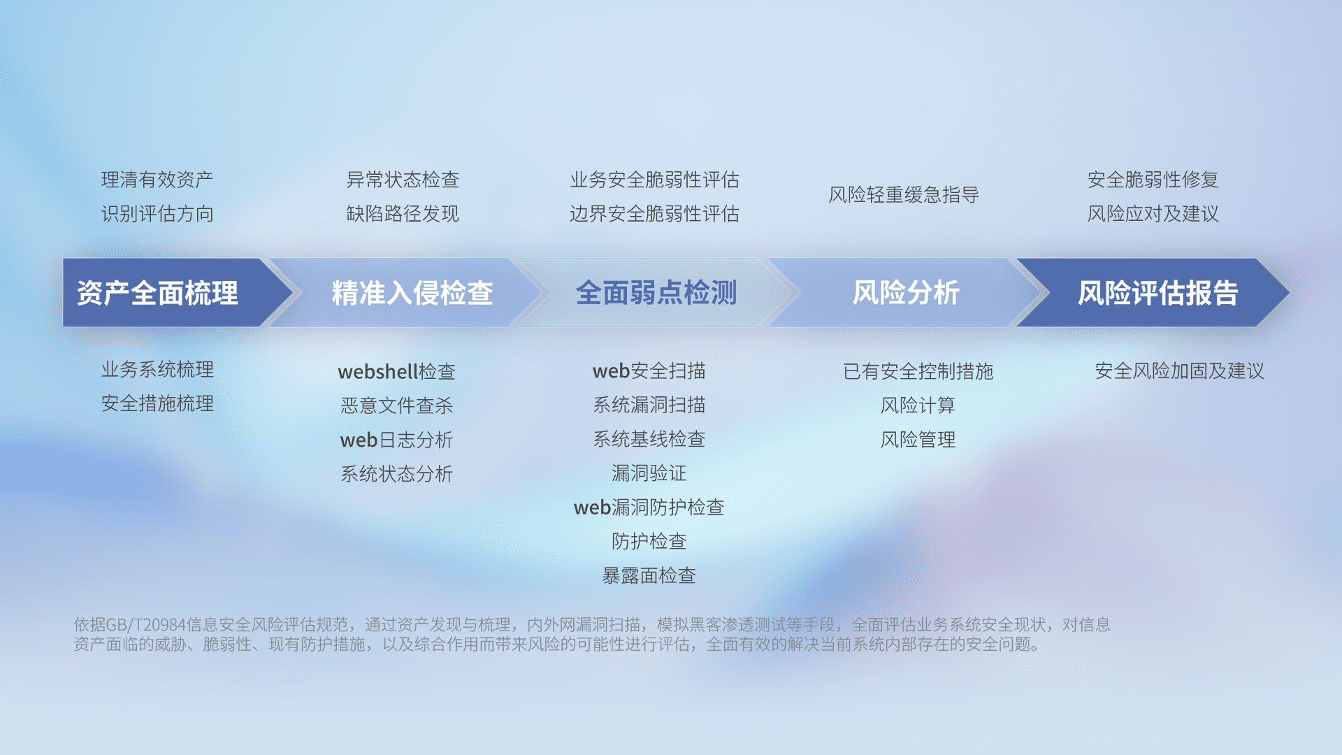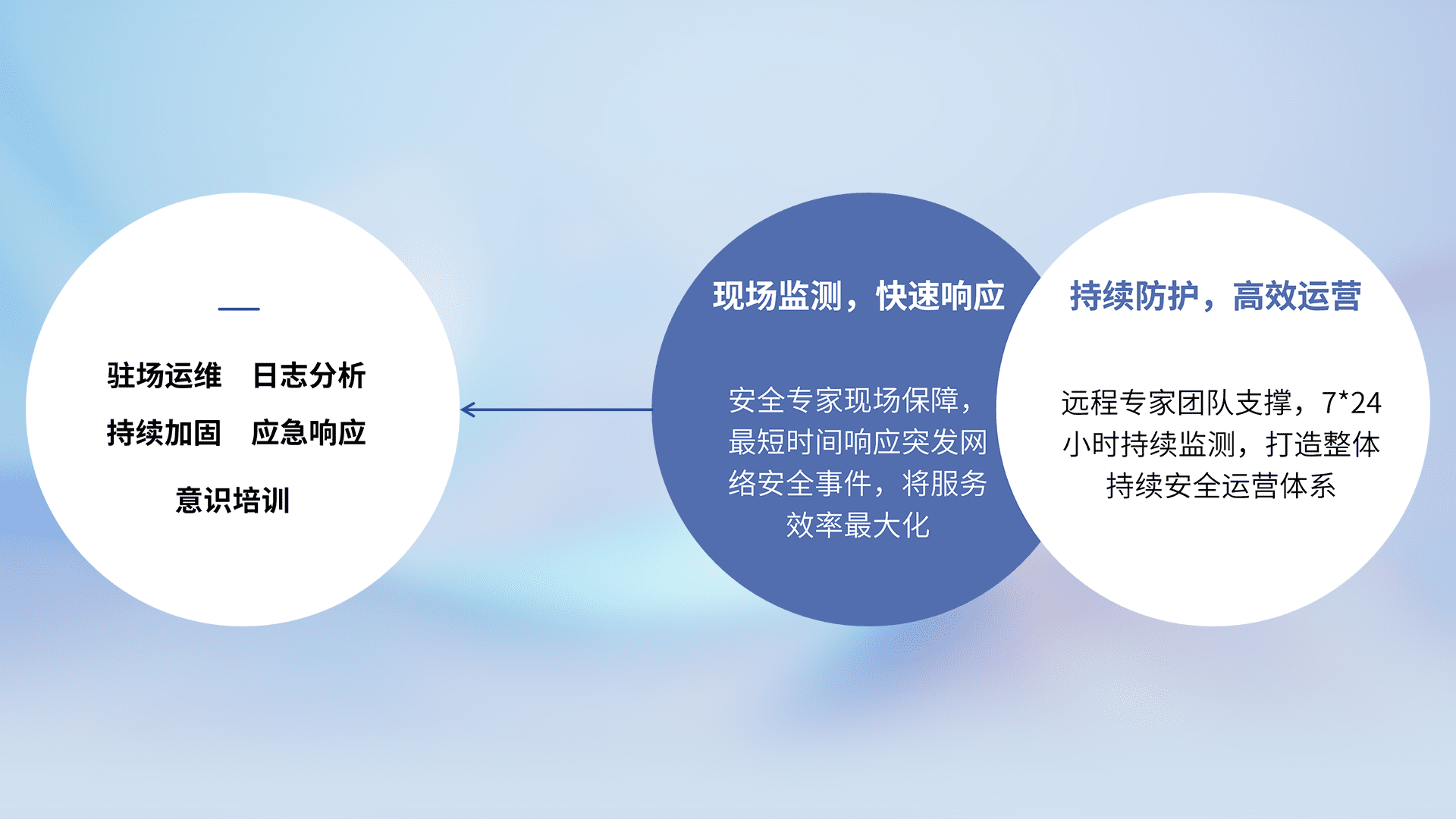 针对客户行业特性,,,,以专业的安全服务+多厂商联合解决方案提供专属的一站式安全管理服务,,,帮助客户全面感知网络空间威胁,,基于识别、、检测、、、分析、、防护、、监测、、、、响应的服务理论模型,,,,从方案咨询、、、集成交付、、评估验证、、、优化加固、、运维运营,,,致力于为客户提供完整的闭环管理式安全服务。。。。以实战经验为客户打造高抵御风险的安全体系,,帮助客户发现威胁、、、对抗威胁、、处置威胁,,,,不断积累安全对抗能力,,持续保障数字化安全。。。。